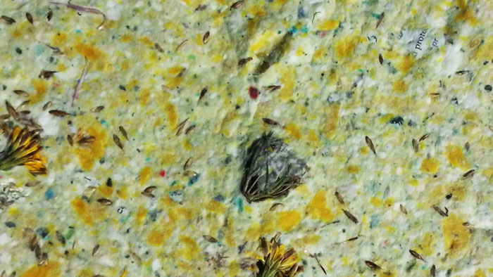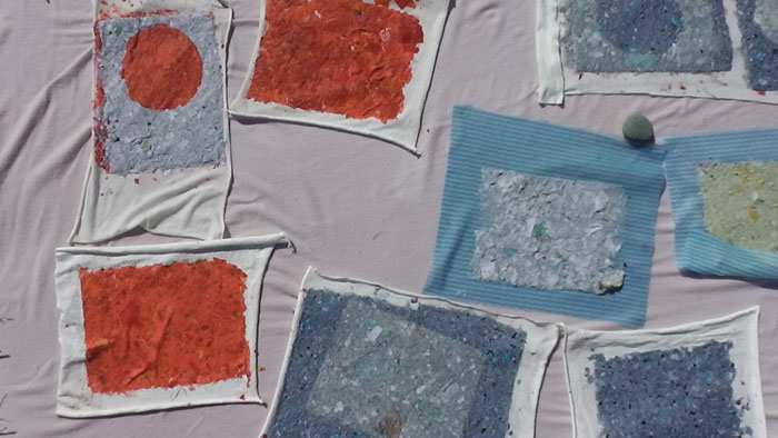 Old, used pieces of paper are torn and blended in a food blender. The pulp is mixed with water in a bowl then a deckle (mould) is used to collect a thin layer.