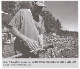 “Every time I use manure I curse it,” exclaims Gary Miller in response to an inquiry about why they use no-till organic methods. Gary Miller and Amy Plant’s half-acre farm is nestled on a south facing slope on San Juan Island. Their major goal in using no-till organic method on the farm is to build soil through cover cropping, not weedy manure. Miller and Plant’s market garden is thick with carrots, greens, broccoli, beans, squash, leeks and tomatoes all planted with minimal soil disturbance and with reliance on hand tools. Miller met Masanobu Fukuoka, author of The One Straw Revolution, 30 years ago and is inspired by his ‘natural farming’ methods. According to Miller they have improved soil quality in their sandy loam soils over the last seven years; earthworms are more abundant, the soil holds moisture better, and it has a better crumbly structure.